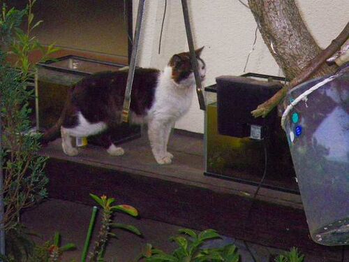 猫が水槽が気になるみたいで手を入れてました。 でも、あまり空腹でなかったのか、水で濡れるのをいやがったのか深追いはしませんでした。 手を入れているところはチャンスを逃してしまいました。