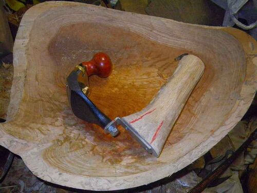プルシェーブを改造しました。長い柄を直角に曲げて周りにぶつからないようにしました。結果は惨敗。台の長さが20mm位しかない鉋を食い込み角度を変えないで引くには直角方向より延長方向の柄の方が確実でした。頑丈なステンのL字金物で取り付けたけど…