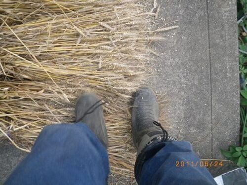 二日天気が続いたのでかなり乾いていました。 5-6把だけだったので、道具無しで長靴で踏みつけねゴム手で揉んで落としました。 ミナミノヒカリは簡単に落ちたのにナンブコムギは足で踏んでも手で揉んでもなかなか落ちません。 コムギそのものはかなり乾い…