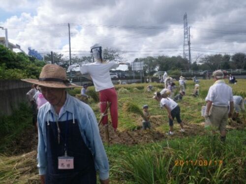 トラストの稲刈りが一週間早くなって今日行われました。 一反歩強の田んぼを手で刈り、束ね、ハザにかけて干します。 人数が多いので人海作戦です。一列に並んで手渡しで束ねた稲を運びました。 御役目の済んだ案山子達は今度はハザの見張りをすることになり…