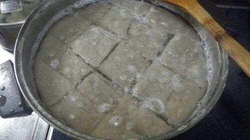 何度も作っているので簡単だと始めたところ水の量、アルカリの量がうろ覚えでした。 すり下ろすのもミキサーより手の方が良いはずと細かい目で卸し始めたら意外と時間がかかって固まり始めてしまいました。 途中でかき混ぜるようにとありましたが手を抜いた…