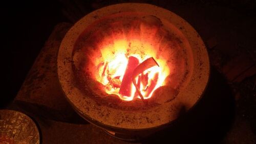 やっと鍛冶屋さんが出来ました。 ネットで買った七輪に竹炭を入れてバーナで火を付け団扇で扇いだけどなかなか良い火にならずドライヤーを漬かったらやっと元気な火となりました。 しかし七輪は作業し難く参りました。炭は竹炭を使ったけどコークスと違って…